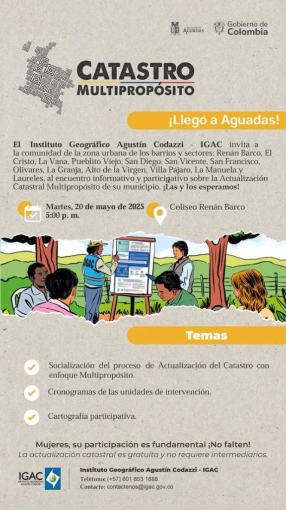 ¡El Catastro Multipropósito llegó a Aguadas! Así la Alcaldía invita para que este martes 20 de mayo a las 5:00 p. m. la comunidad participe en un encuentro en el coliseo Renán Barco.