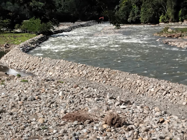 Las labores de mitigación incluyen desviar el río y quebradas cercanas, hacia la parte oriental de la cuenca. Una excavadora construye jarillones de contención de las aguas.