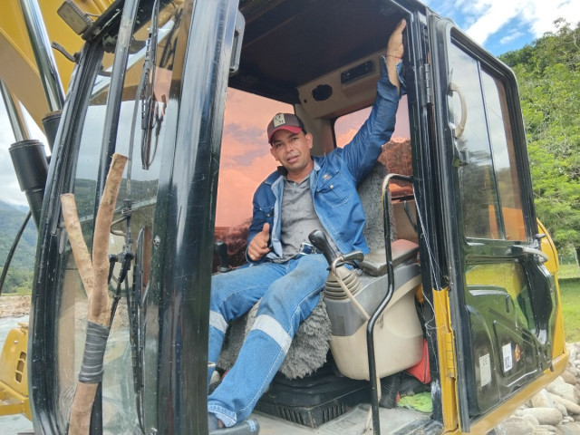 Héctor Patiño, operador de la retroexcavadora que desvía el caudal, está satisfecho por su trabajo con el equipo de Gestión del Riesgo antioqueño: "Vamos a seguir aquí con esta muralla. El río hay que desviarlo cerca de la montaña y secarlo abajo para que los carros y las motos pasen".