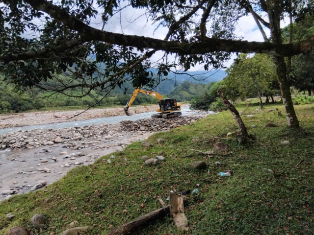 La retroexcavadora ha construido jarillones sobre la cuenca del río, pero las crecientes de la lluvia elevan el nivel de las aguas y obstruyen el paso. Habrá un camino provisional mientras se inician los trabajos de recuperación de la banca en el sector de La Circasia. Se espera la llegada de más maquinaria al lugar.