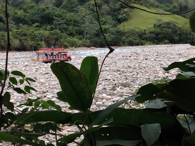 Carros, chivas y motos se han visto cruzando un río entre Caldas y Antioquia para desplazarse entre dos municipios que se quedaron sin vía el 11 de abril, por una creciente del caudal.