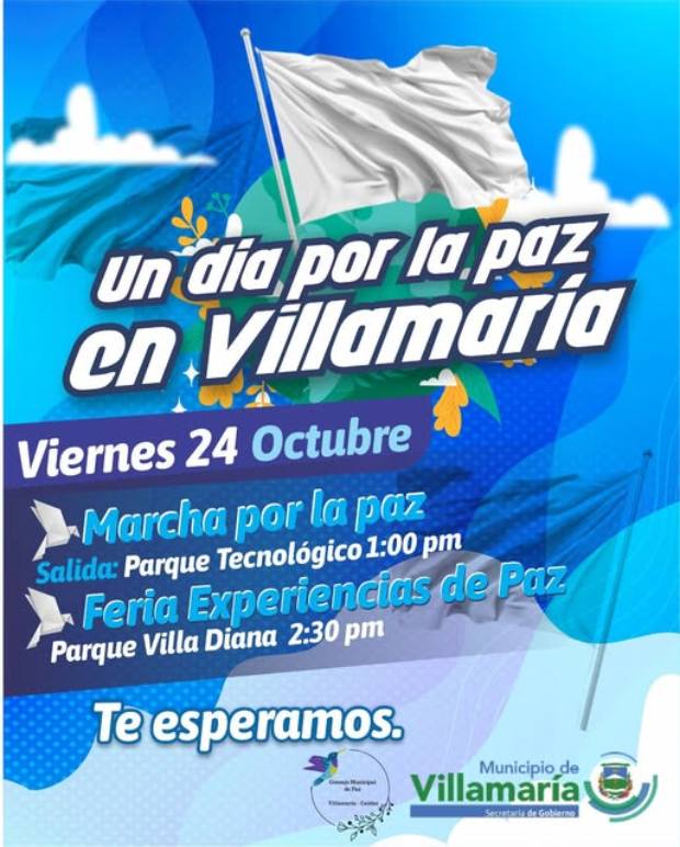 “... Iniciando con un marcha por las calles de nuestro municipio y haciendo manifiesto el deseo de Paz en Villamaría. También viviremos la feria de experiecias de paz”, adiciona el Gobierno local. La congregación será en el Parque Villa Diana desde las 2:30 p.m.