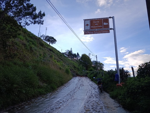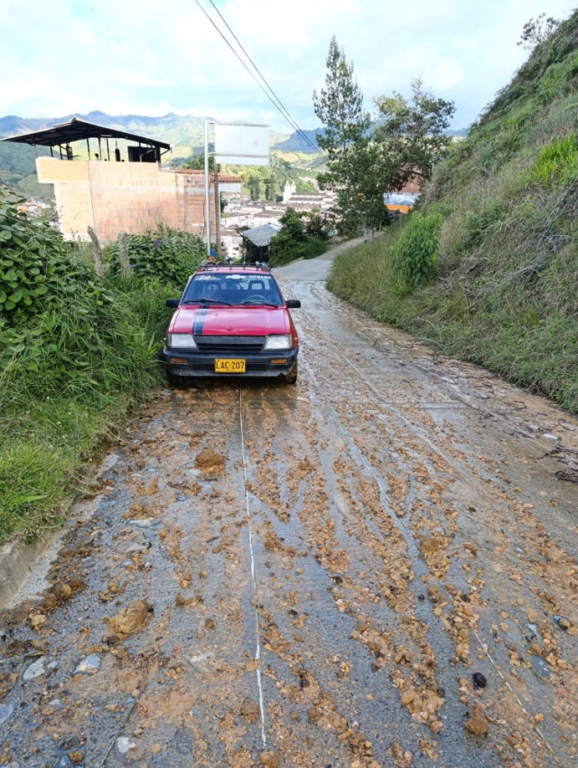 Un vehículo que se dirigía hacia Monserrate, en Aguadas, se quedó parqueado en la mitad de la vía porque sus ocupantes "no pudieron subir" a causa del derrumbe que bloqueó el paso.