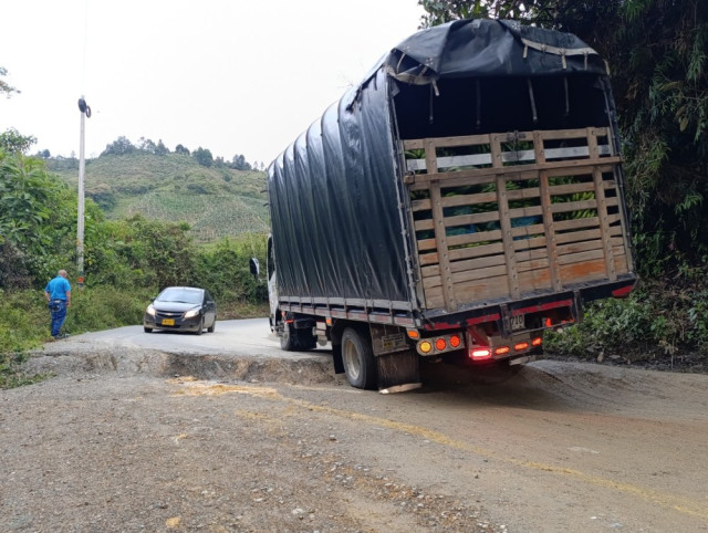 Los camiones se ladeaban al pasar por el hundimiento de la vía Aguadas-Pácora en el sector La Casona.