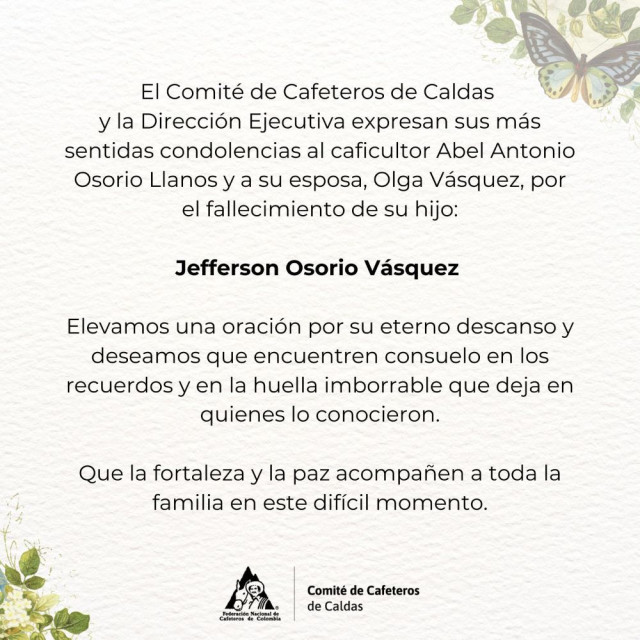 “Jefferson Osorio Vásquez, quien es hijo de uno de nuestros miembros del Comité Municipal de Manzanares. Expresamos nuestra más sentidas condolencias al caficultor Abel Antonio Osorio Llanos y a su esposa, Olga Vásquez, por el fallecimiento de su hijo”.