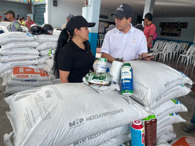 Jairo Salazar, funcionario de la Agencia de Desarrollo Rural, le entrega los insumos a Gloria Eucaris Salazar.