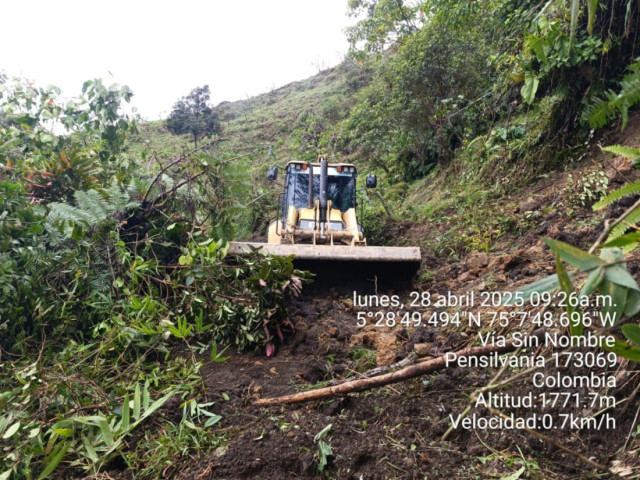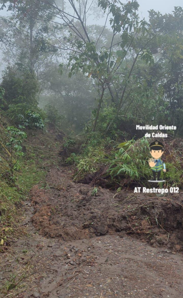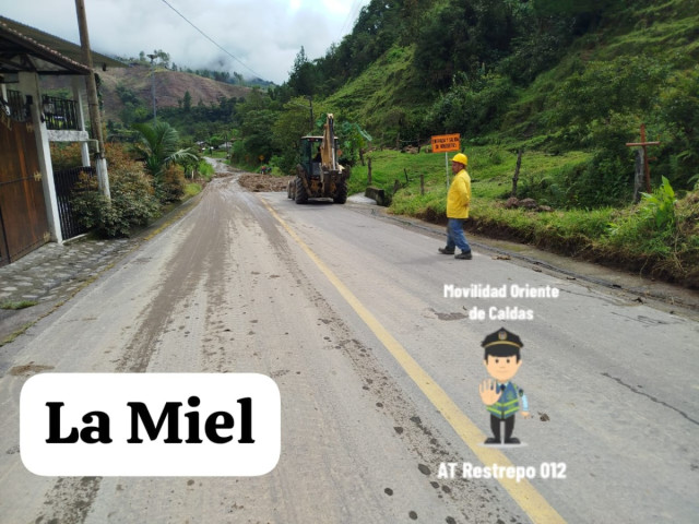 La vía Manzanares-Pensilvania, en el sector La Miel, tiene maquinaria amarilla despejando un derrumbe. Debido a la caída de material, se sugiere transitar con precaución una vez se habilite la carretera.