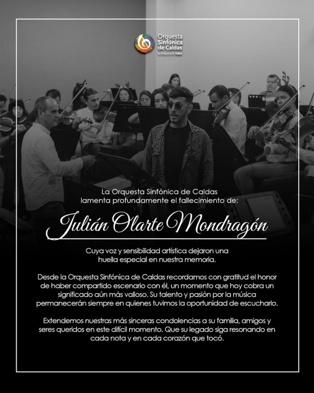 “La Secretaria de Cultura de Caldas lamenta profundamente el fallecimiento de Julián Andrés Olarte Mondragón, músico, compositor e intérprete. Hijo de los Maestros María Mónica Mondragón y Paulo Andrés Olarte Rendón”, dice el comunicado publicado por la Secretaría de Cultura