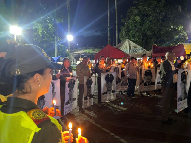 Algunos asistentes portaron pendones con la imagen de sus familiares y una vela como símbolo de esperanza para quienes continúan en el ejercicio de custodiar la seguridad de todos los ciudadanos.