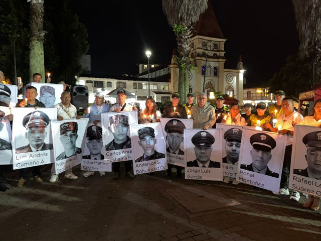 En la Abuela de Caldas el punto de encuentro fue la estación de Policía. Allí reservistas de la Policía y del Ejército llegaron con velas para orar por sus compañeros caídos en combate.