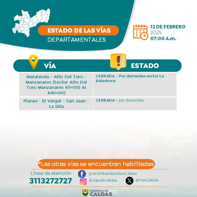 Manzanares (Caldas) amaneció este miércoles (12 de febrero) afectado por derrumbes en dos carreteras. Estas son las cinco vías cerradas en el departamento y las siete con pasos restringidos. Planee su viaje.