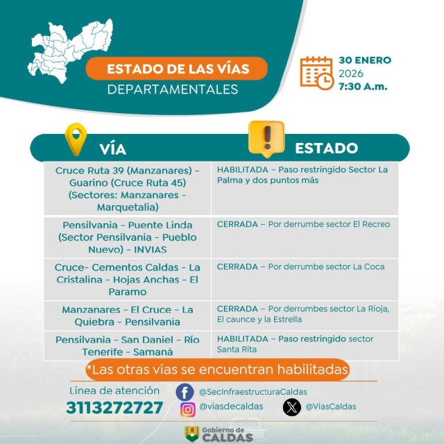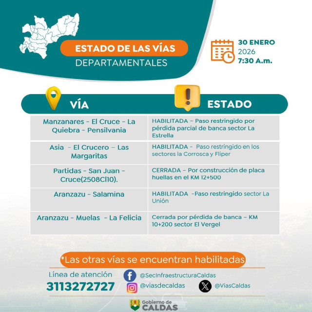 Este es el estado de las vías de Caldas este viernes (30 de enero)