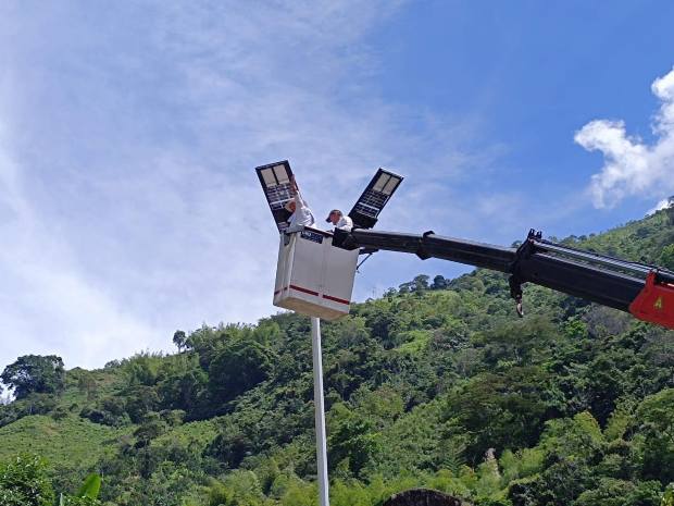 “Buenas noticias para todos los que transitan por el puente sobre el río Guarinó. Esta estructura cuenta con cuatro nuevas lámparas solares que ya están en funcionamiento”, dice la Administración municipal.