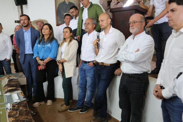 Desde el colegio La Sagrada Familia de Palestina, la ministra de Transporte, María Fernanda Rojas, revisa las obras del Aeropuerto del Café, en compañía del gobernador de Caldas, Henry Gutiérrez Ángel; el gerente de la Unidad de Gestión del Patrimonio Autónomo, Fernando Merchán Ramos, varias de las firmas interesadas en el proyecto y algunos diputados de Caldas.