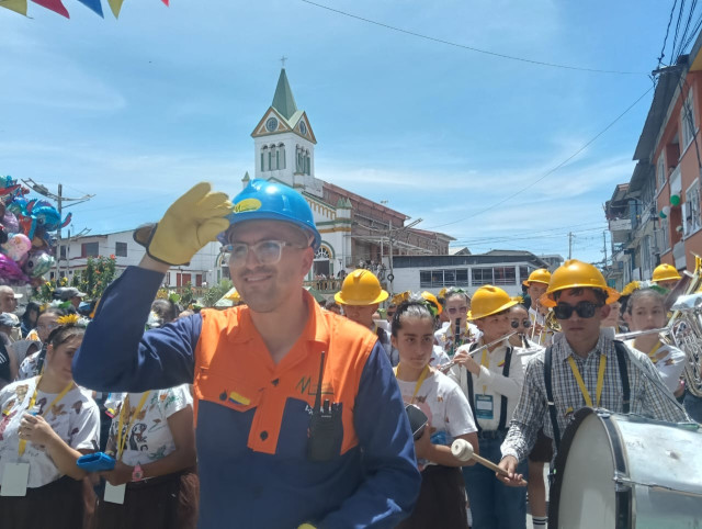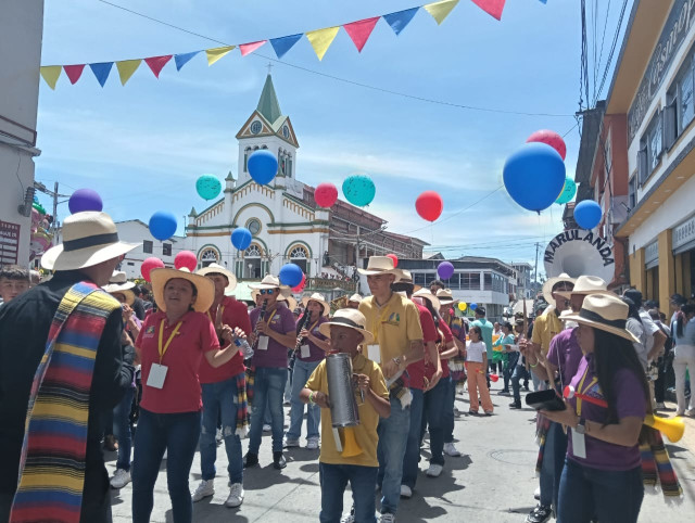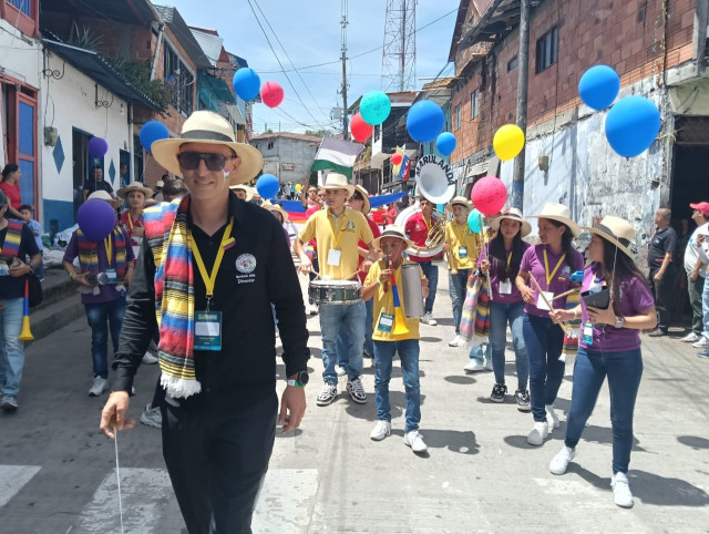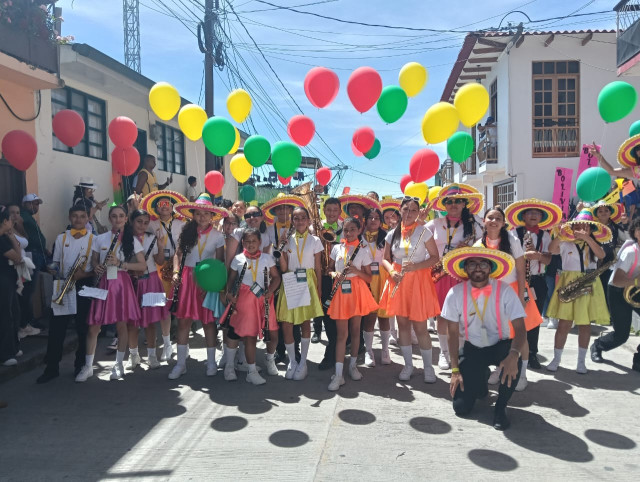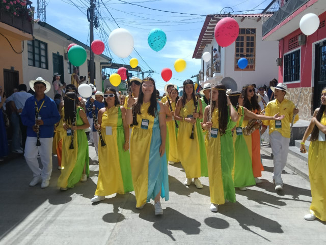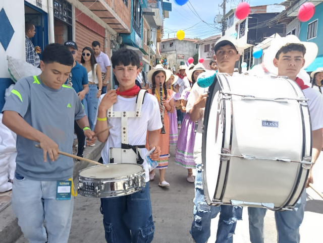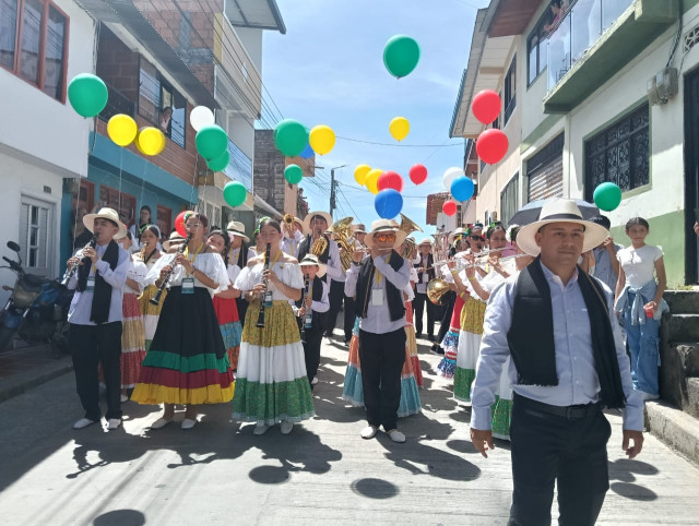 Música, color, danza, folclor y alegría en el desfile de las bandas participantes desde el barrio San Vicente hasta el parque Risaralda, en Marquetalia (Caldas).