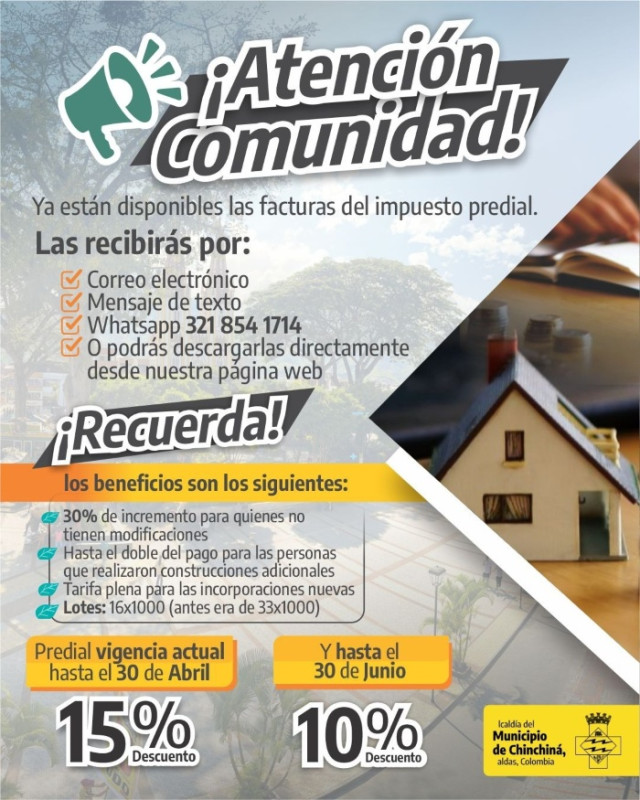 Las nuevas facturas del predial en Chinchiná se pueden obtener a través del sitio web oficial de la Alcaldía (www.chinchina-caldas.gov.co) o solicitarlas por Whatsapp en el número 321 854 1714.