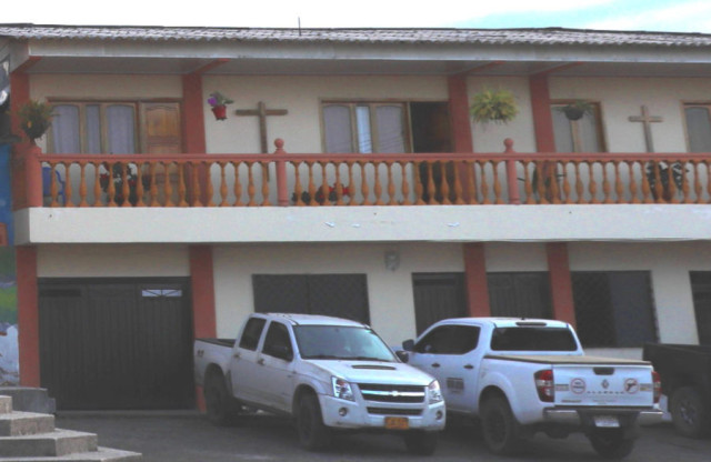 Antes: El techo y parte de la infraestructura de la Casa Cural fue destruida con cilindros bomba. En la fachada los subversivos plasmaron grafitis alusivos al Bloque José María Córdova Farc-EP.