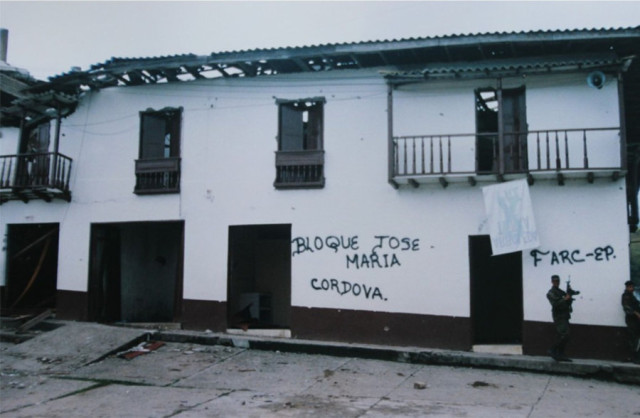 El Frente 47 de las Fac liderado por Elda Neyis Mosquera García, alias Karina, atacó con cilindros bomba el corregimiento de Arboleda (Pensilvania). En la imagen, el banco del pueblo era la Caja Agraria, uno de los objetivos de los guerrilleros. Ahora en el lugar fue construida la Corregiduría, una moderna edificación donde funcionan diferentes dependencias oficiales.