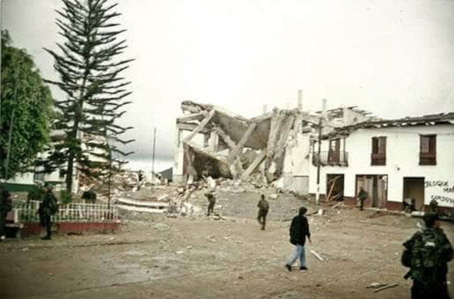Antes: En la esquina aledaña al Templo San José funcionaban Telecom y la Corregiduría. Desde allí los valientes policías respondieron al ataque durante más de 24 horas. Sin embargo, en ese sitio varios de ellos perdieron la vida y el golpe final vino con la explosión de una volquetabomba que destruyó todo a su alrededor y en la calle dejó un boquete de varios metros.