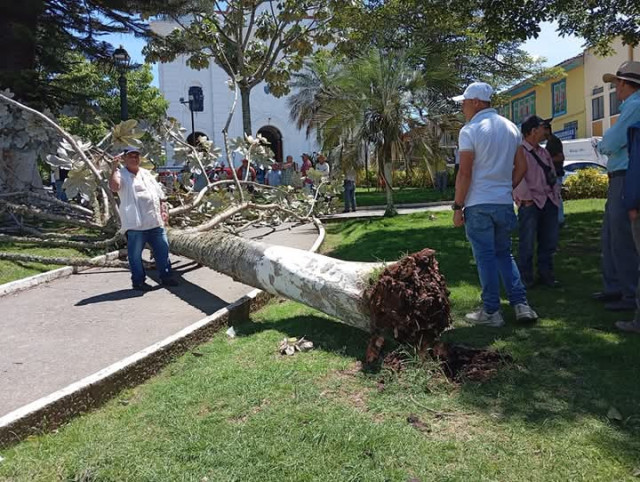El parque principal del municipio de la matraca amaneció este domingo (13 de abril) con un aspecto diferente. Uno de los árboles que hay sembrados en el lugar se desplomó luego de las fuertes lluvias y vientos recientes registrados en el Norte de Caldas.