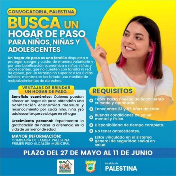 La invitación es de Alcaldía de Palestina y la Comisaría de Familia con el propósito de encontrar un hogar de paso para niños, niñas y adolescentes.