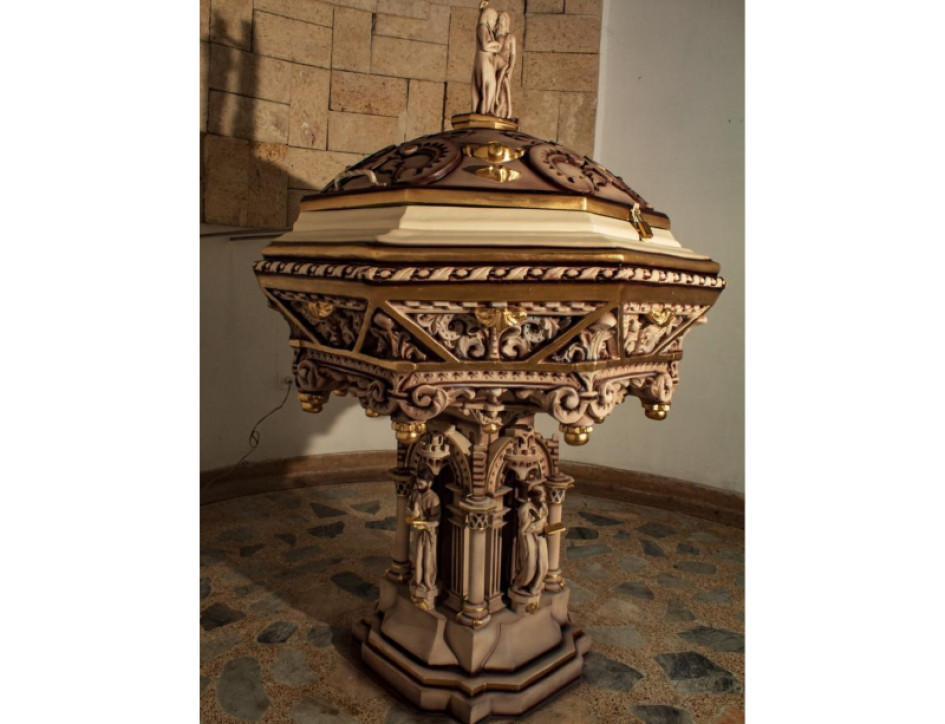 En la cima de la pila la figura de Jesús mientras bautiza a Pedro.