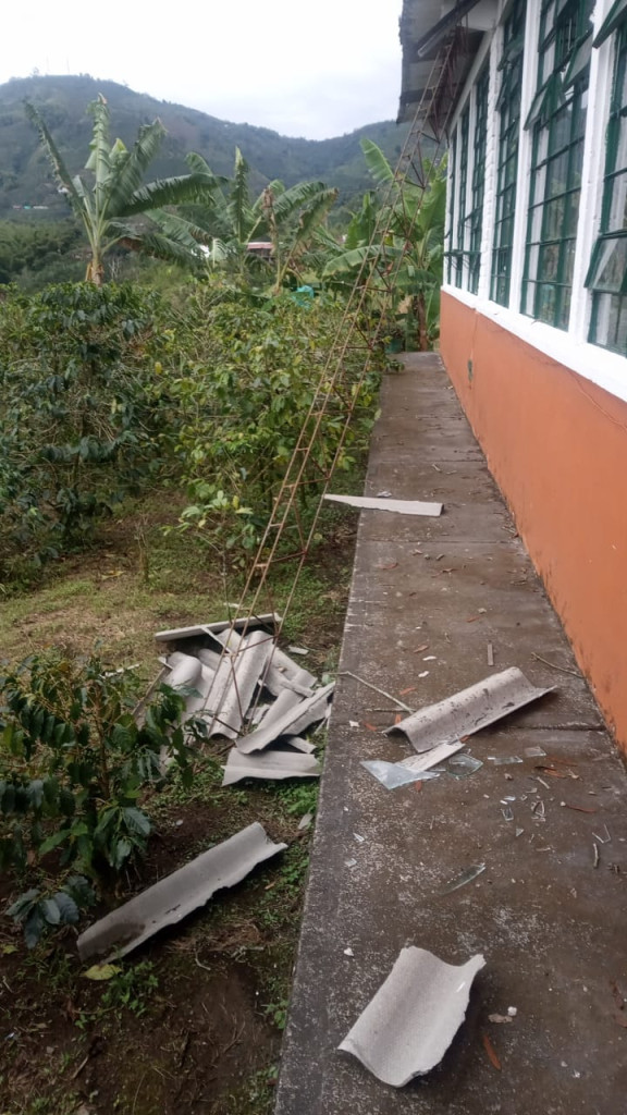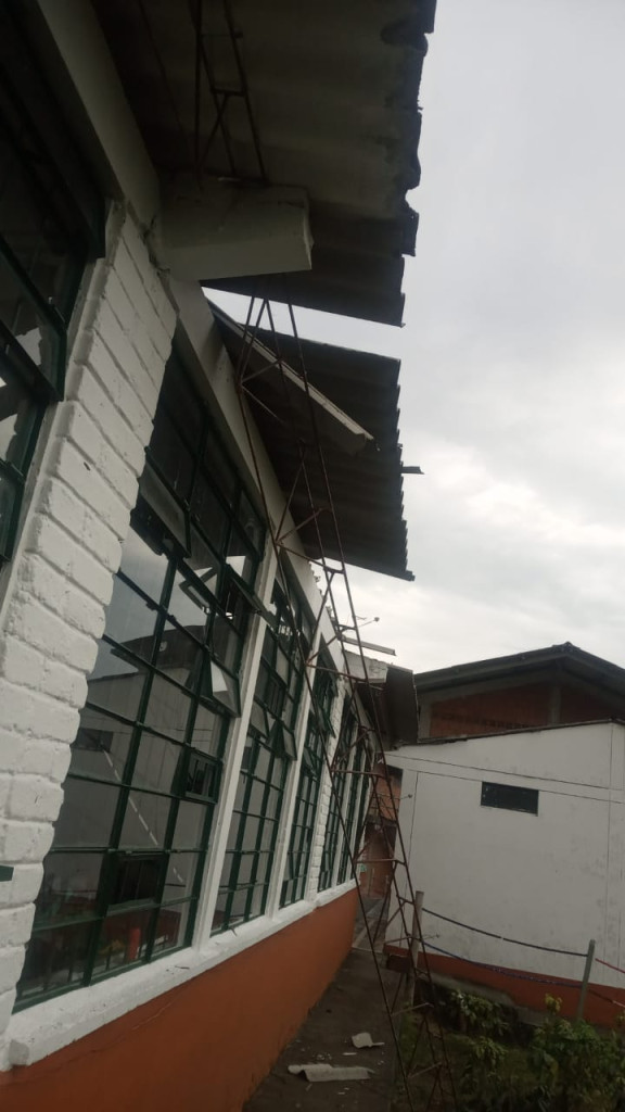 Volaron tejas en el colegio rural Eduardo Gómez Arrubla de Chinchiná. El pasado viernes (31 de enero) por la tarde, un vendaval provocó el destechamiento parcial de dos salones de la primaria.