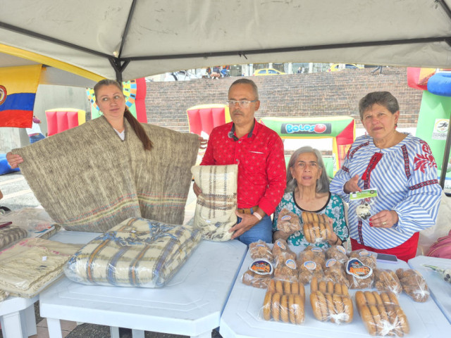 Darío Alonso Zapata Marín, coordinador de la Mesa de Víctimas de Marulanda, mostró productos como ruanas, panelitas de leche, cucas, llaveros y cebo de ovejo. "Nos pueden ubicar en la Cooperativa Ovina de Marulanda o llegar a la Plaza de Bolívar". Anotó que las ruanas se consiguen desde $230 mil en adelante. Asimismo, en su estand está acompañado por Jhoana Osorio, Sara Inés Restrepo y Fanny Escobar Gómez.