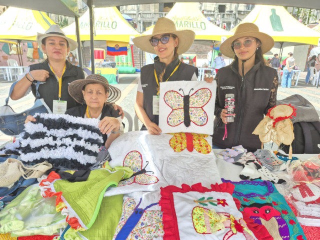 María Edilma Gallego Ruiz (sentada) llegó como parte de la delegación de víctimas de Risaralda, lugar en el que habita desde hace unos 20 años luego de que perdiera a su esposo y a su hijo en Supía por el conflicto armado. "Los productos que ustedes ven aquí los hago con mis manos. Hago tendidos para las camas, baños, bolsos, tapetes. Nadie me enseñó yo misma aprendí a hacerlo. Los interesados pueden contactarme al frente del Hospital de Risaralda", dijo Gallego Ruiz. Está acompañada por Adriana Muñoz, Hortensia Vélez y Érika Zapata Montes.