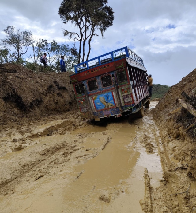 ¿Viajar en chiva? En el Alto del Volcán se bajan los pasajeros para que el vehículo tome impulso y atraviese la zona tambaleando. En los días de más lluvias y derrumbes, el fango tapa casi la mitad del vehículo.