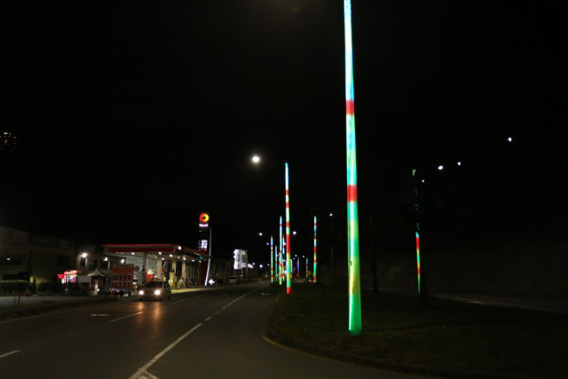La coloración de los 101 postes se dirige con un control remoto y se diseña con una aplicación, punto por punto.