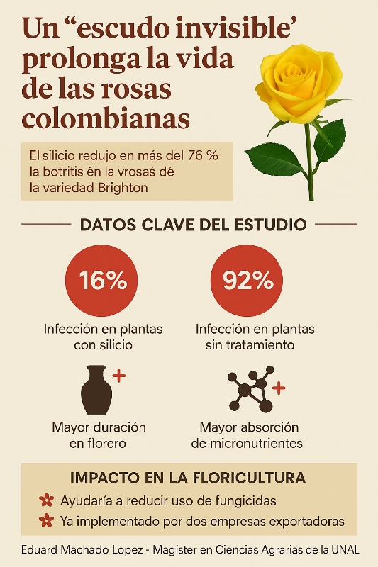 Este elemento químico, presente en el suelo pero poco aprovechado en el cultivo de flores, logró reducir en más del 76 % la presencia de botritis (Botrytis cinerea), el hongo responsable del marchitamiento prematuro de las rosas.