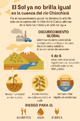 Un reciente estudio de la Universidad Nacional de Colombia (UNAL) Sede Manizales confirmó una preocupante tendencia: la cuenca del río Chinchiná, eje vital para el desarrollo económico y social del departamento y la región, está recibiendo menos radiación solar.