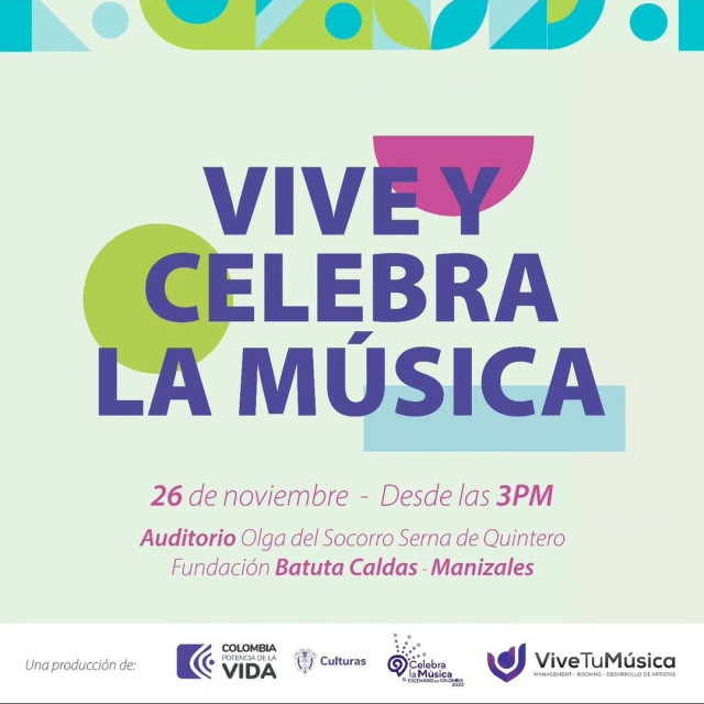 Manizales. Vive y celebra la música será el concierto que se realizará este domingo 26 de noviembre con la presentación de siete artistas en el auditorio Olga del Socorro Serna de Quintero en la Fundación Batuta Caldas a partir de las 3:00 p.m. Los artistas son: Aguas Ardientes, AB-FNX, Rockadura, Tambor Hembra, Fernanda Canta, Angie Daniela y el dueto de los Hermanos Uribe.
