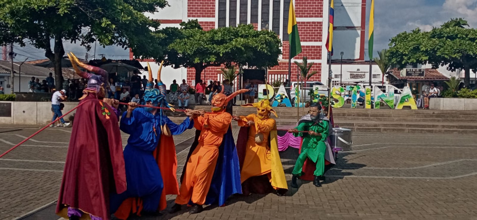El Parque de Bolívar de Palestina sirvió de tarima para presentar la obra Dionisio el diablo. El municipio celebra el noveno Festival de Teatro.