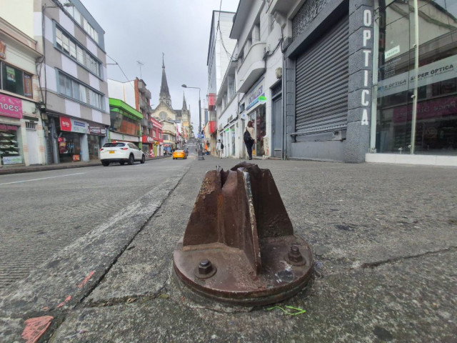 En la carrera 22, entre calles 25 y 26, quedó expuesta la parte inferior de una lámpara, lo que se ha convertido en una trampa para los peatones que circulan por este concurrido sector del centro de Manizales.