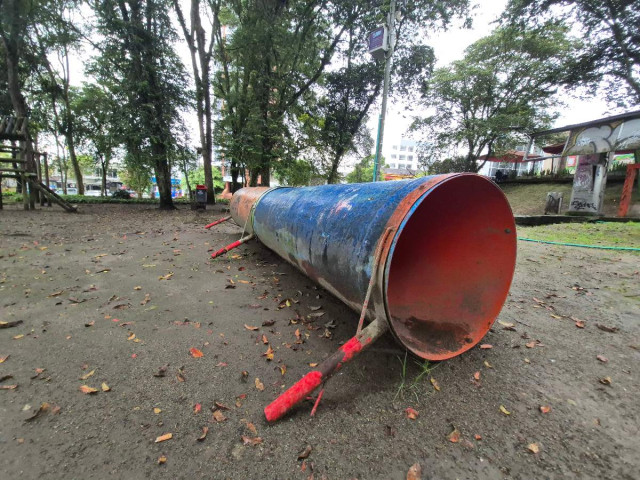 En el parque hay tuberías eléctricas expuestas, con riesgo de electrocución, y tubos, tornillos y varillas sobresalientes, que pueden causar accidentes.