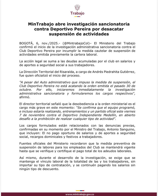 Ante la situación, el Ministerio del Trabajo confirmó el inicio de una investigación administrativa sancionatoria contra el Deportivo Pereira, por incumplir la medida cautelar de suspensión de actividades que había sido ordenada por la cartera laboral.
