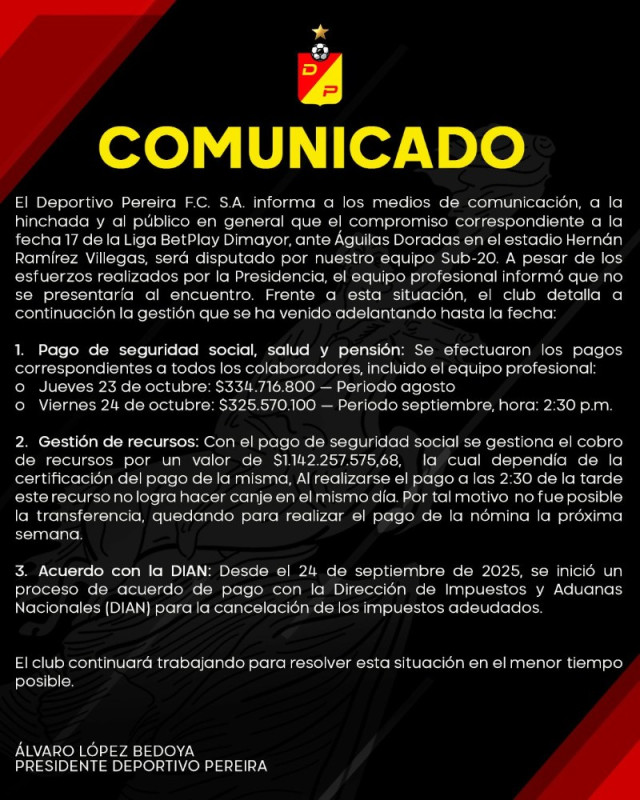 En esta ocasión, en un comunicado emitido hoy martes (28 de octubre), confirmó que ya empezó un proceso administrativo sancionatorio contra el Club Deportivo Pereira F.C. S.A., por presuntos incumplimientos en materia laboral y de seguridad social.