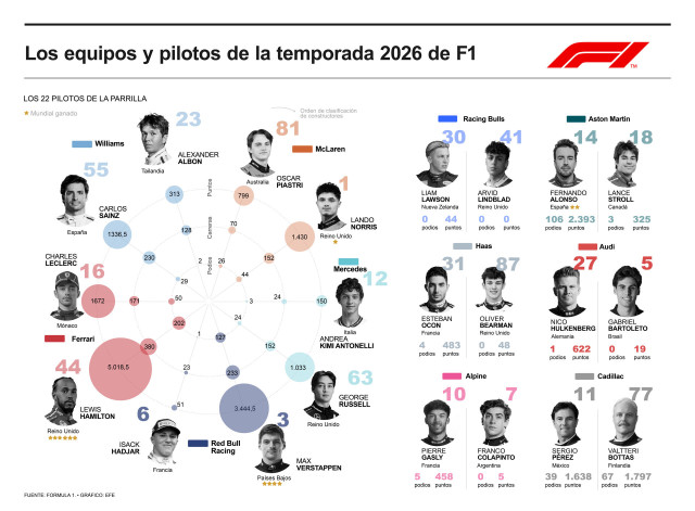 El joven británico-sueco Arvid Linblad, de 18 años, que correrá en Racing Bulls (ex Alpha Tauri, antigua Toro Rosso) será el único debutante en una temporada en la que entra en juego la alemana Audi, que -de nuevo con el veterano alemán Nico Hülkenberg y el joven brasileño Gabriel Bortoletto al volante- asume la estructura de lo que era Sauber.