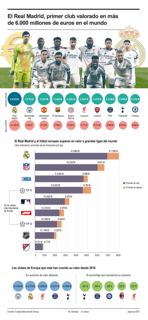 Esto supone un incremento del 2 % en su valor con respecto al año pasado, según detalla el informe anual de esta publicación. Durante la temporada 2023/2024, el club merengue obtuvo unos ingresos de 1.130 millones de dólares, lo que le permite alzarse como el primer club de fútbol en traspasar el umbral de los mil millones.