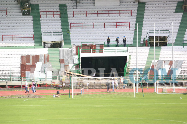 Foto | Luis Fernando Trejos | LA PATRIA Para el descenso completo del antiguo soporte, de la pantalla norte del estadio Palogrande, se cubrieron varios tramos de tribuna, previendo algún incidente por el peso de la estructura.