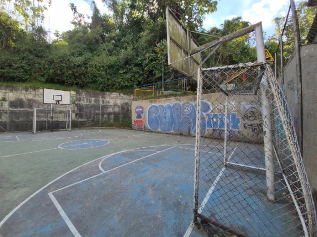 Así quedó la cancha del barrio Bosques del Norte, de Manizales, tras las obras de mantenimiento. Faltan los aros en los tableros de baloncesto.