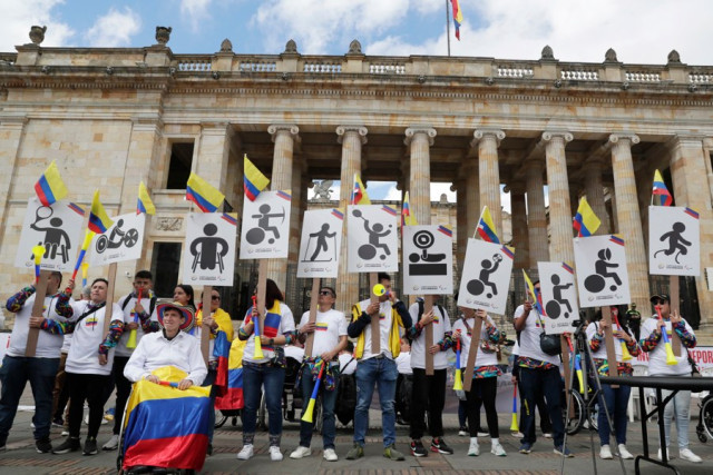 Fotos | EFE | LA PATRIA Personas sostienen una pancarta durante una protesta convocada por el Comité Olímpico Colombiano este lunes, en la Plaza de Bolívar en Bogotá (Colombia).