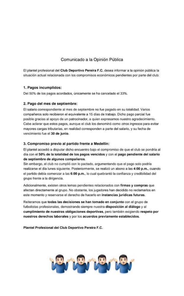 En redes sociales los jugadores del Deportivo Pereira compartieron un comunicado desmintiendo al club sobre los pagos