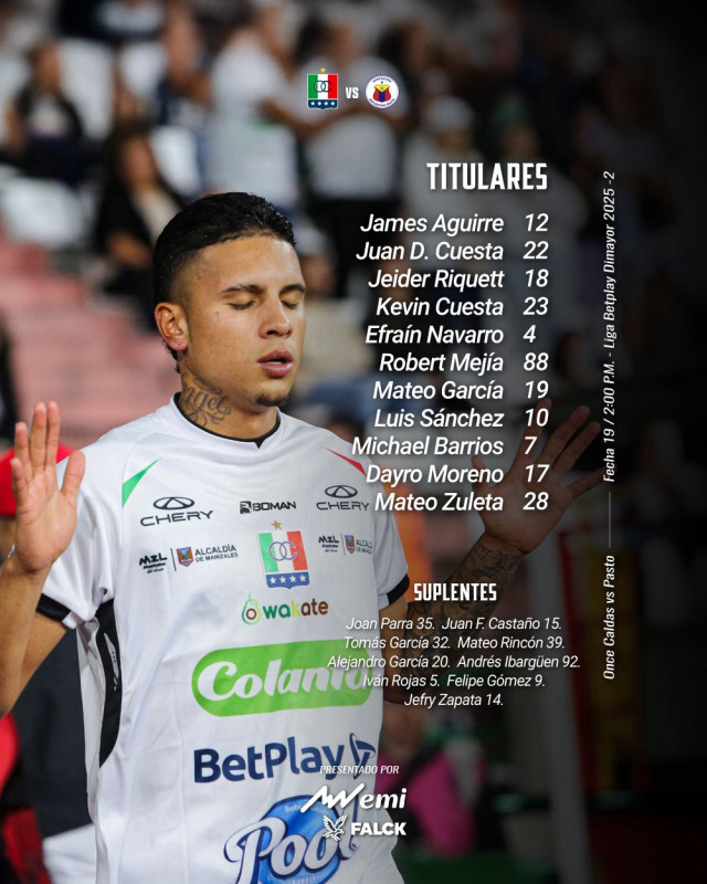 El Once Caldas venció este domingo (9 de noviembre) al Deportivo Pasto, con la mínima diferencia, en el estadio Palogrande de Manizales, por la fecha 19 de la Liga BetPlay II 2025.
