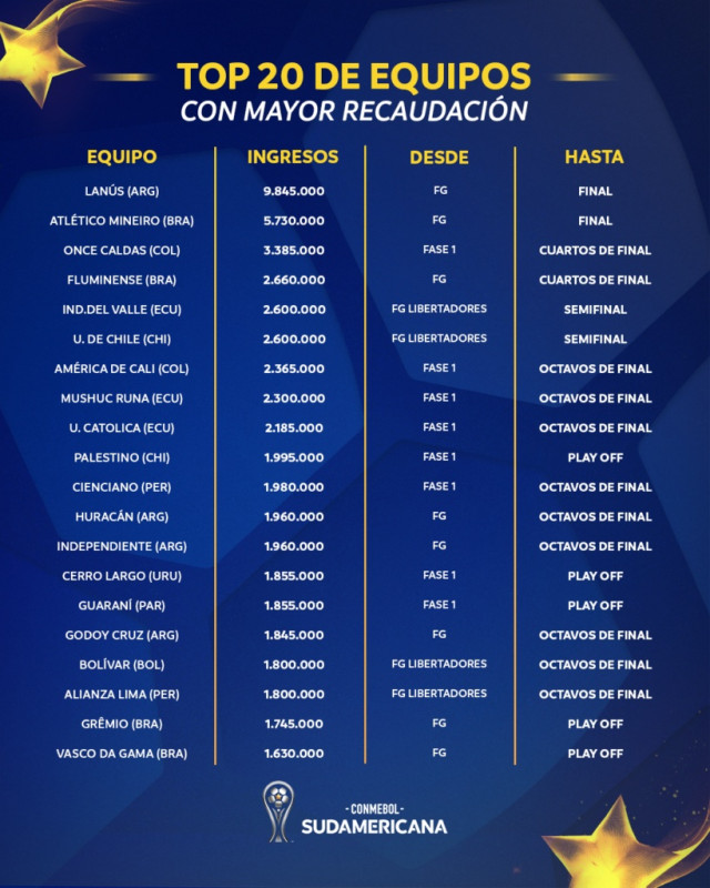 Este monto lo ubicó en el tercer lugar del podio entre los clubes participantes en el torneo, por detrás de los finalistas: Lanús (9 millones 845 mil dólares) y Atlético Mineiro (5 millones 730 mil dólares).
