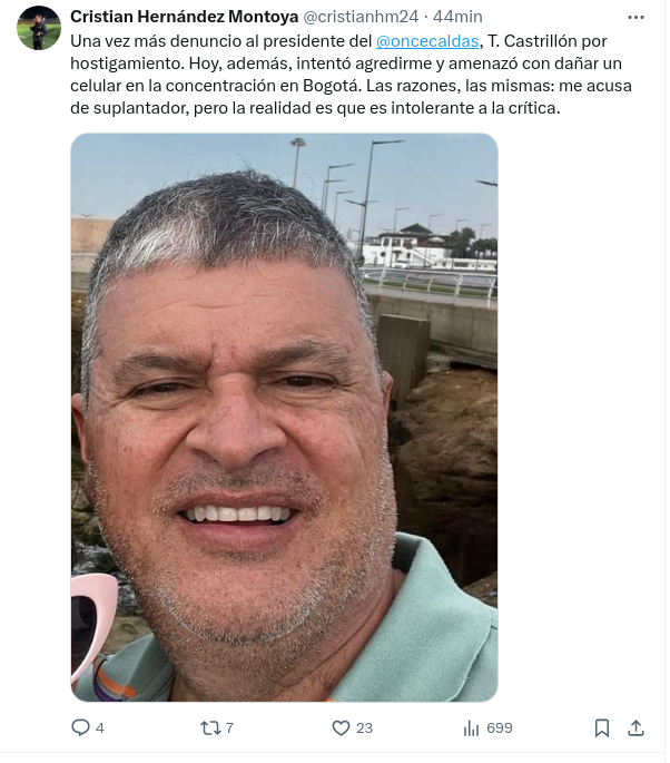 Allí, Cristian Hernández y Silvio Rivera, miembros del equipo periodístico de Las Voces del Fútbol, estaban haciendo reportería previa cuando fueron abordados por Tulio Mario Castrillón, presidente del Once Caldas.