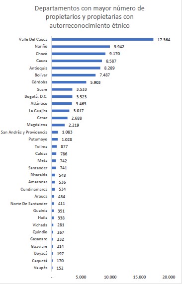 En términos territoriales, la mayor concentración de propietarios y propietarias con autorreconocimiento étnico-racial se presenta en Valle del Cauca, Nariño. Chocó, Cauca y Antioquia (ver infográfico).