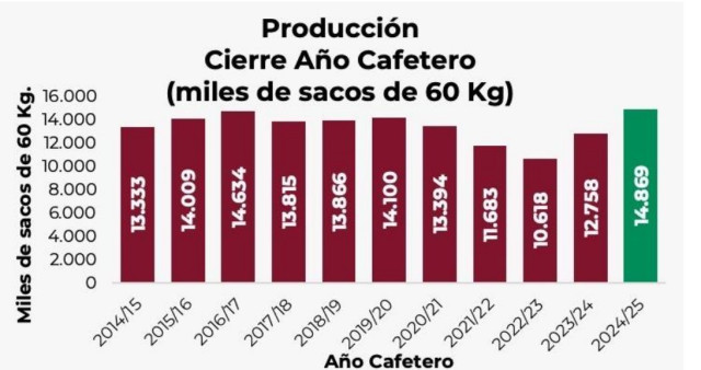 De acuerdo con las estadísticas del gremio, el país produjo 14 millones 869 mil sacos de 60 kilos, el mejor reporte en 33 años. El reporte solo es superado por los resultados obtenidos entre octubre de 1992 y septiembre de 1993 cuando se produjeron 14 millones 947 mil sacos.
